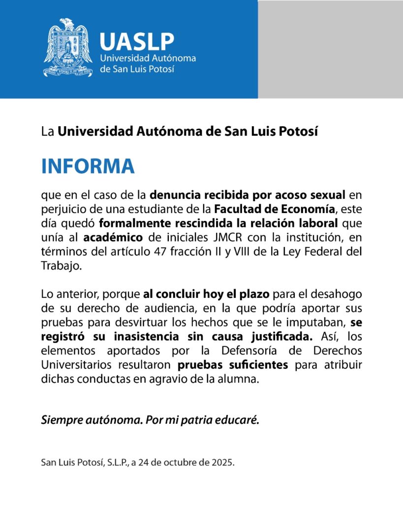 San Luis Potosí, SLP.- La Universidad Autónoma de San Luis Potosí (UASLP) informó que este viernes fue rescindida la relación laboral con el académico de iniciales J.M.C.R., tras la denuncia por acoso sexual en perjuicio de una estudiante de la Facultad de Economía.
