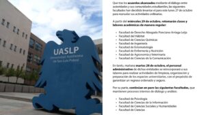 Este viernes 24 de octubre, en un marco de respeto y al continuar el acercamiento entre el estudiantado y las autoridades de la Universidad Autónoma de San Luis Potosí (UASLP), el rector doctor Alejandro Javier Zermeño Guerra recibió múltiples pliegos petitorios que recogen las solicitudes de las y los alumnos de facultades de la institución.